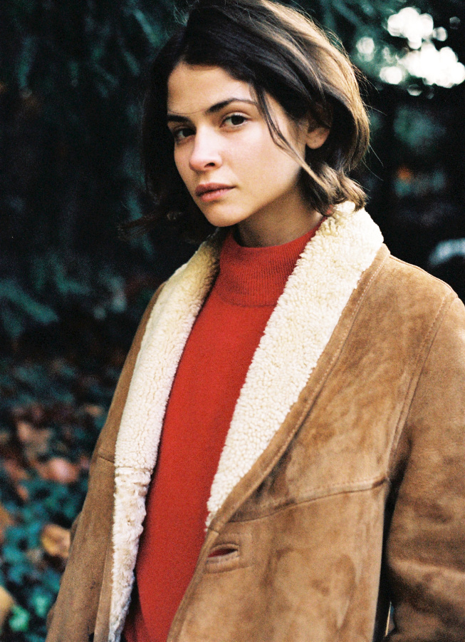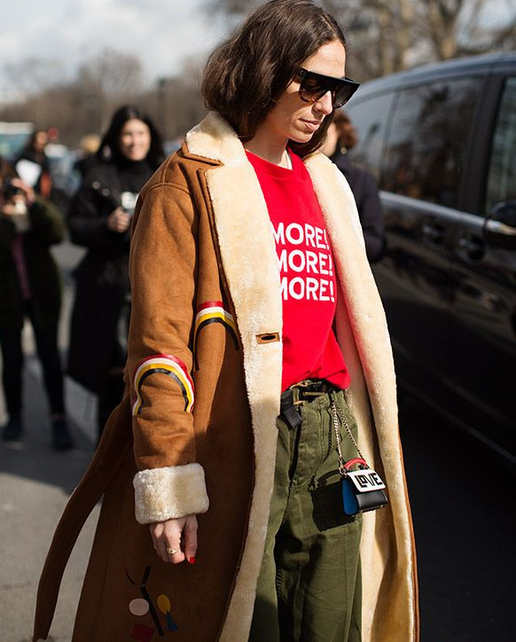 Le traiter comme un blouson d'automne à part entière en le mixant à l'ensemble sous-pull gris + mini jupe en jean brut + collants gris en coton côtelé + derbies épaisses noires + bonnet noir.