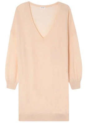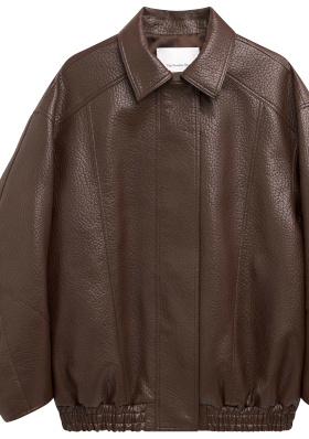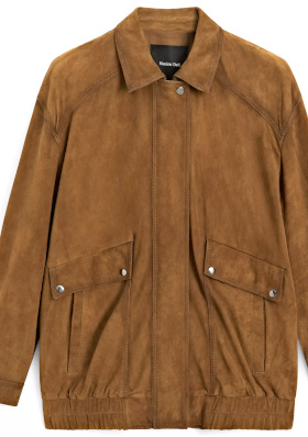 Le blouson oversize, porté ouvert, apporte une note légèrement rugueuse qui contrebalance la douceur des teintes poudreuses.