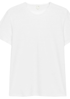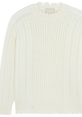 Le tee-shirt blanc dépasse légèrement sous le pull.
