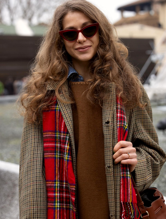Exploiter la présence très discrète d'une couleur dans un motif - ici la fine ligne rouge du prince-de-galles - pour légitimer l'introduction plus visible de cette même couleur dans le look (voir ici).