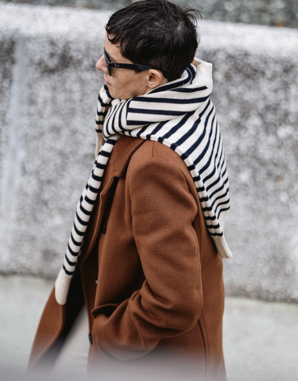 Apporter une touche graphique à ses pardessus en les réchauffant d'un pull marinière porté sur les épaules (voir ici).