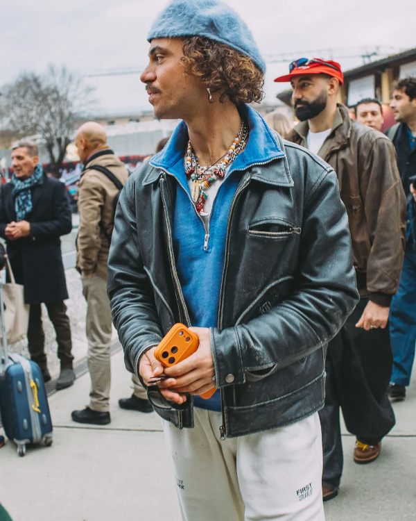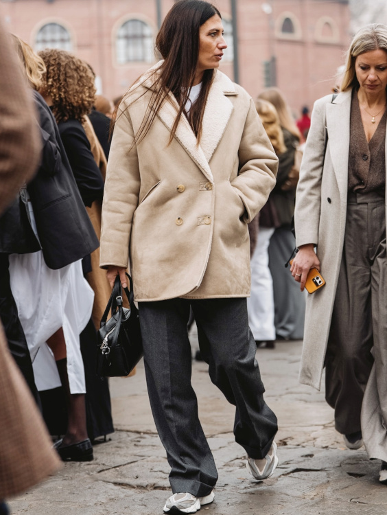 Associer veste en peau lainée, pantalon de costume et runnings (voir ici).